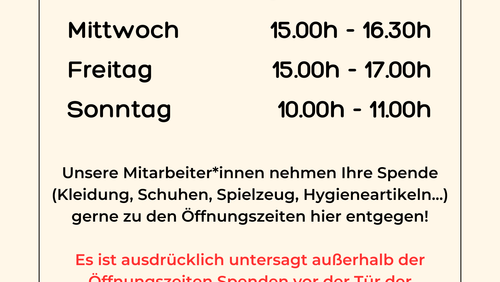 Wer etwas benötigt oder für die Kleiderkammer spenden möchet, kommte bitte in die Hauptstraße 120 zu den Öffnungszeiten