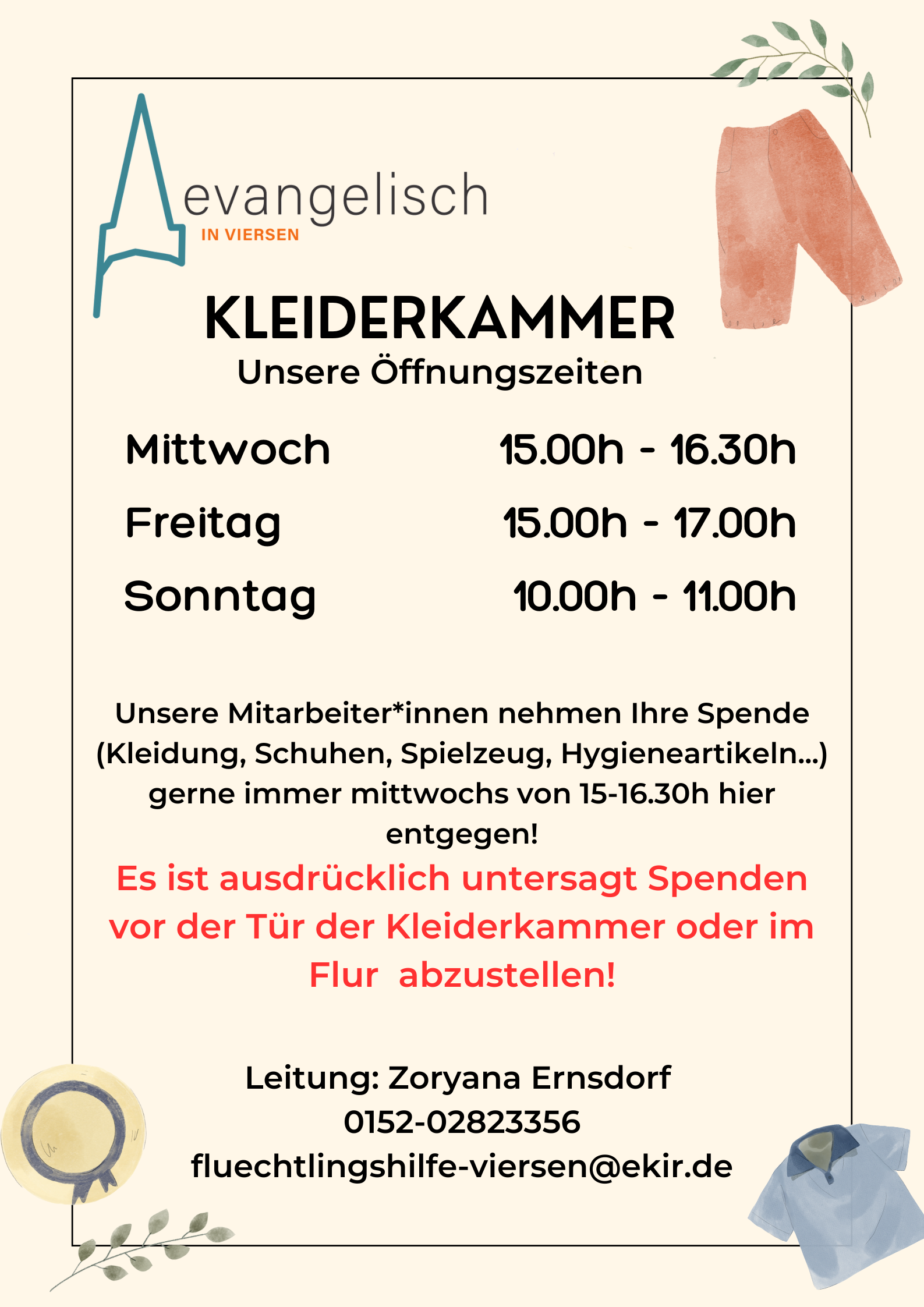 Leitung Kleiderkammer: Zoryana Ernsdorf +49 1520 282 33 56